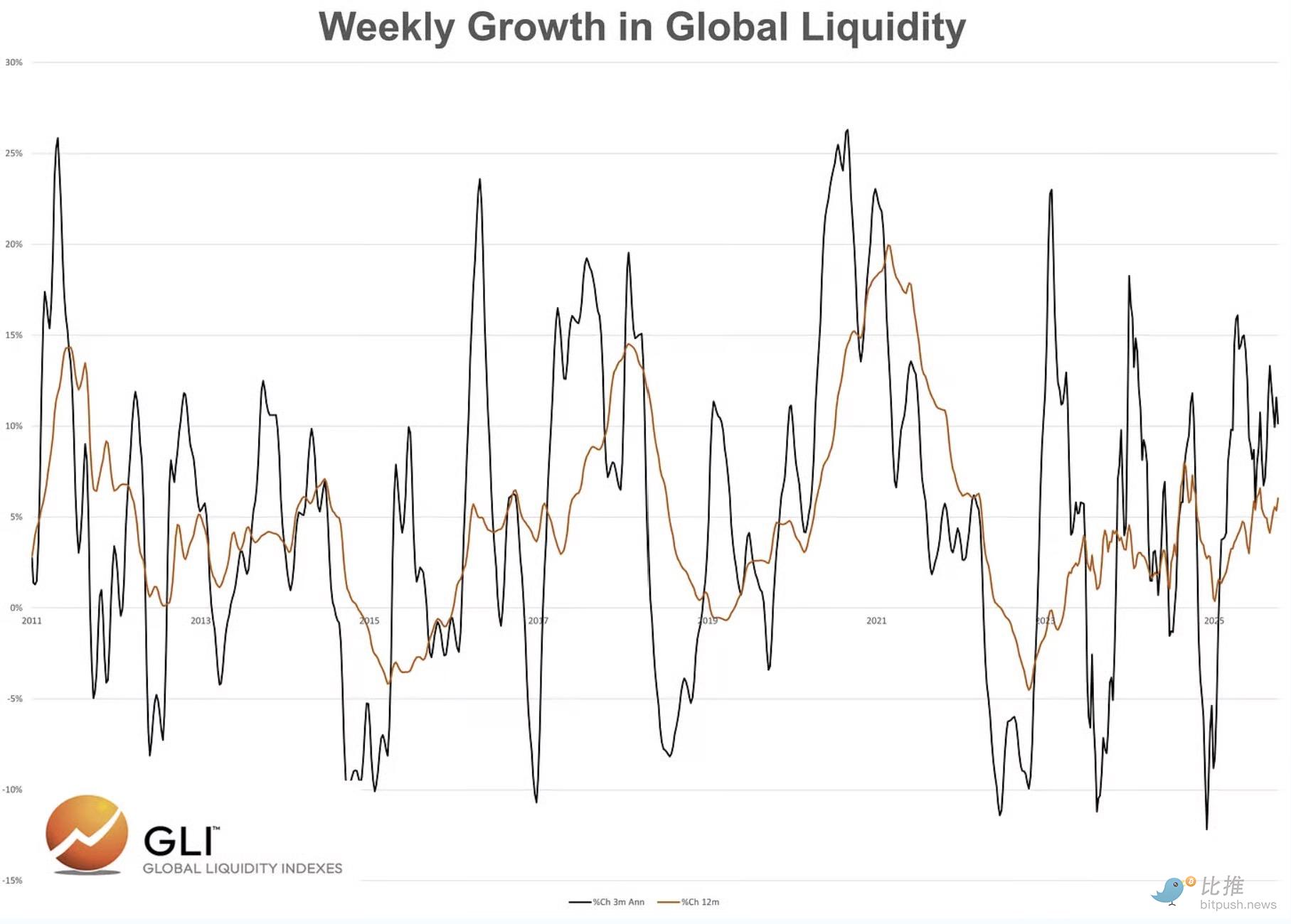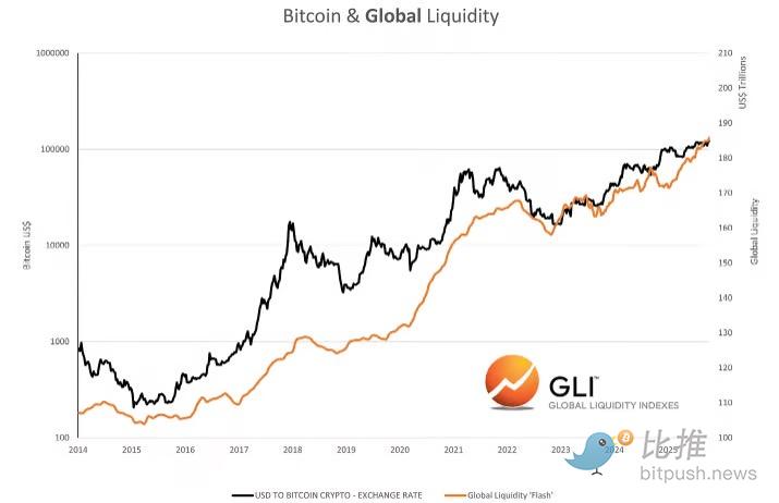 According to Global Liquidity Indexes: "Historical data shows that changes in liquidity often precede changes in risk asset prices, with a lag of about three months. Specifically, increases in global liquidity are often accompanied by positive performance in risk assets, while decreases in liquidity often foreshadow weak price trends."