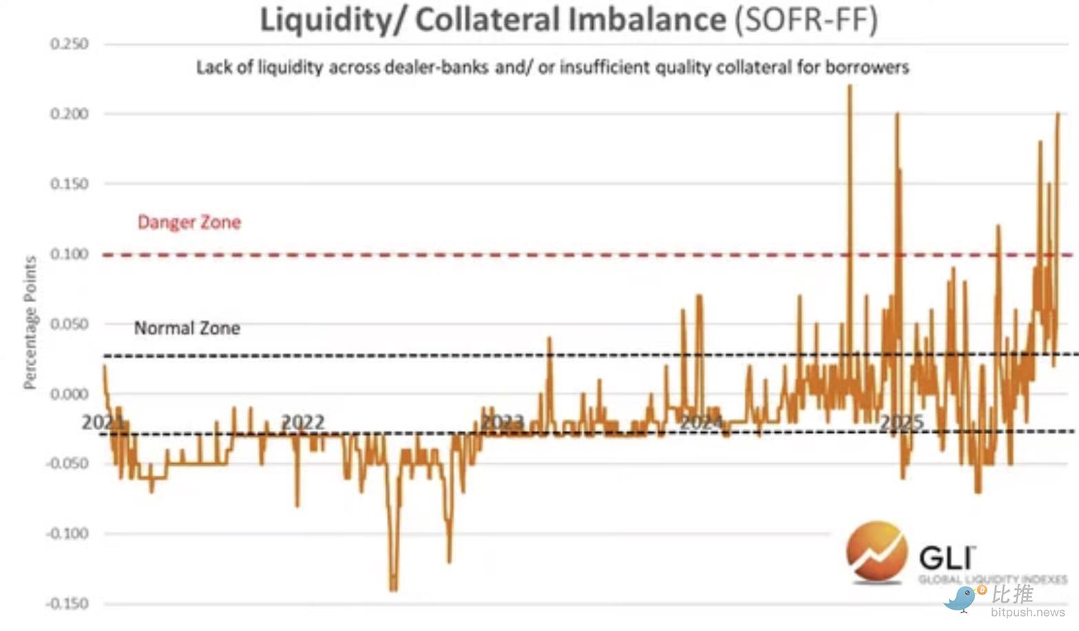 Below, we can see the growing imbalance between dealer banks' liquidity and available collateral in overnight funding. This indicates an increasing shortage of money market liquidity as dealers scramble for cash or collateral.